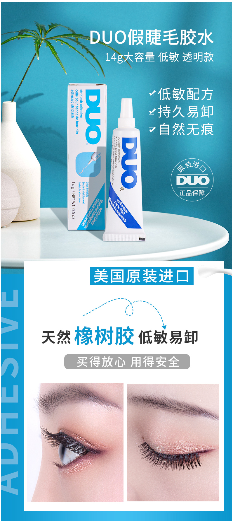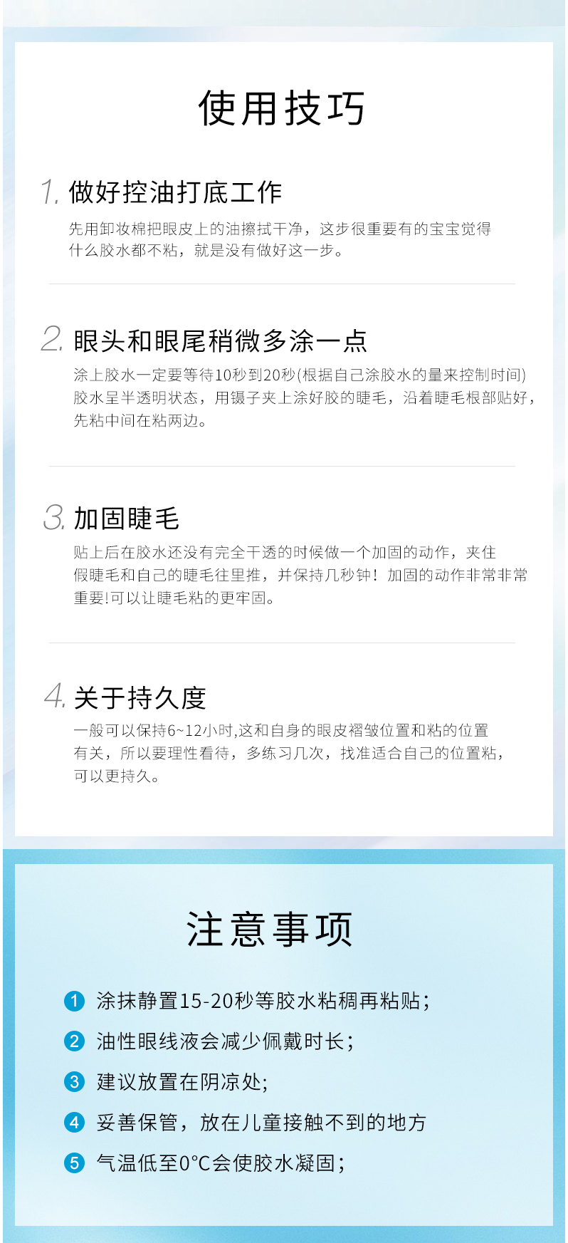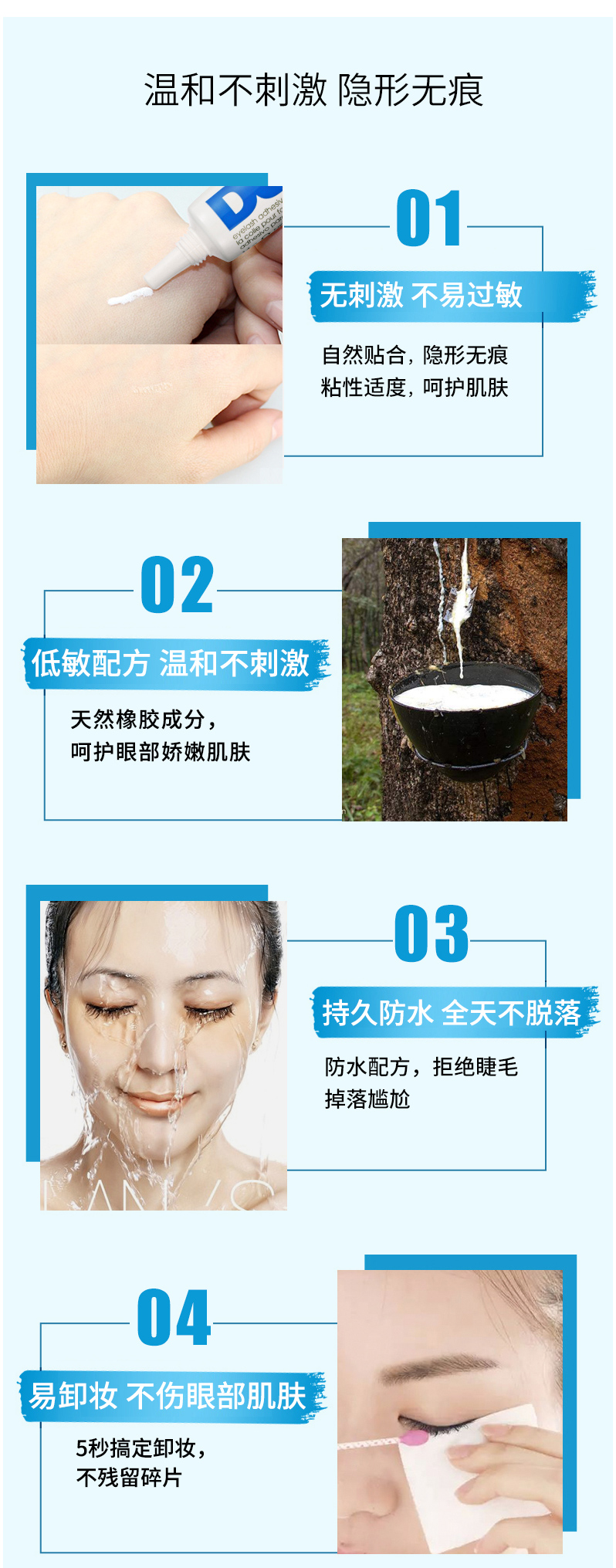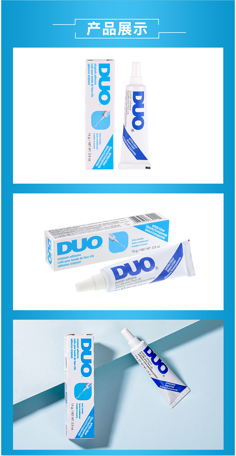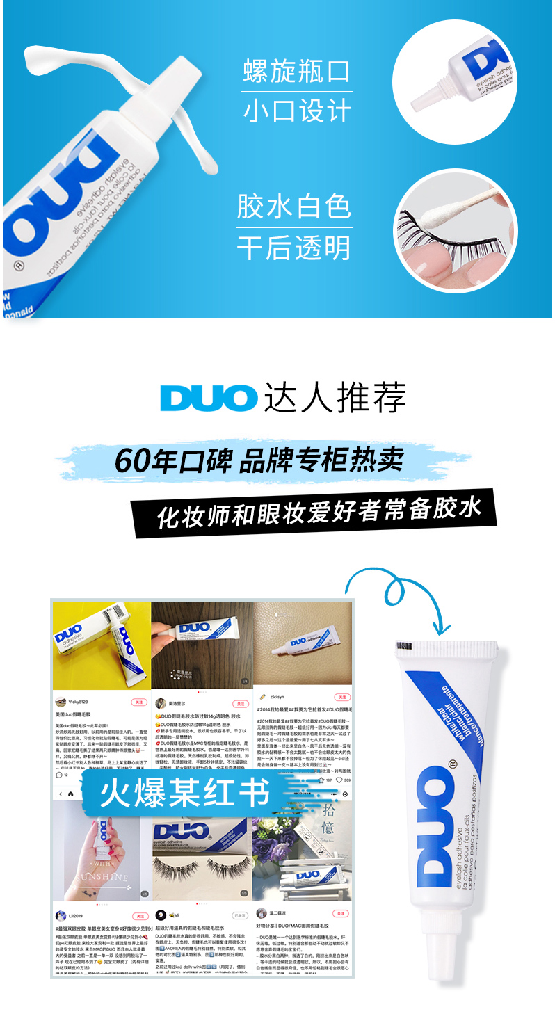 适用于条带状假睫毛,待干时为透明; 安全、持久,易于卸除