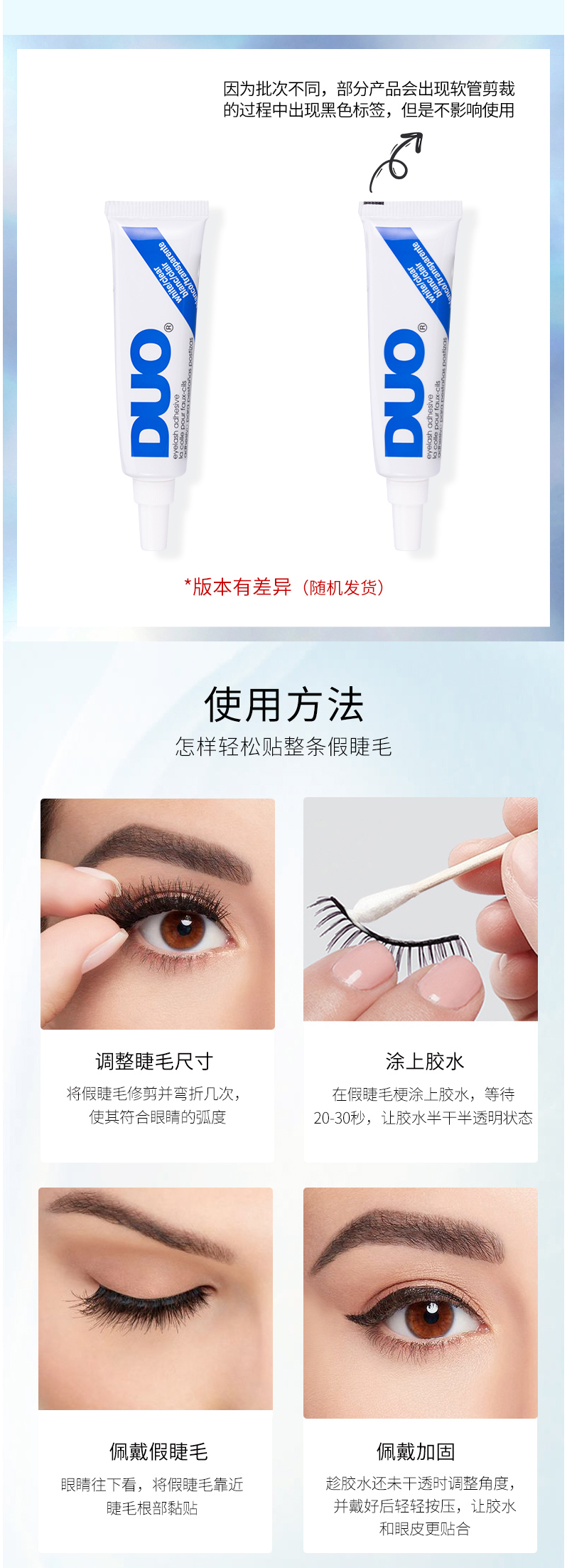 使用方法 : 第一步:调整合适的睫毛尺寸。第二步:假睫毛上涂上胶水,等待至半干 。第三步:佩戴假睫毛