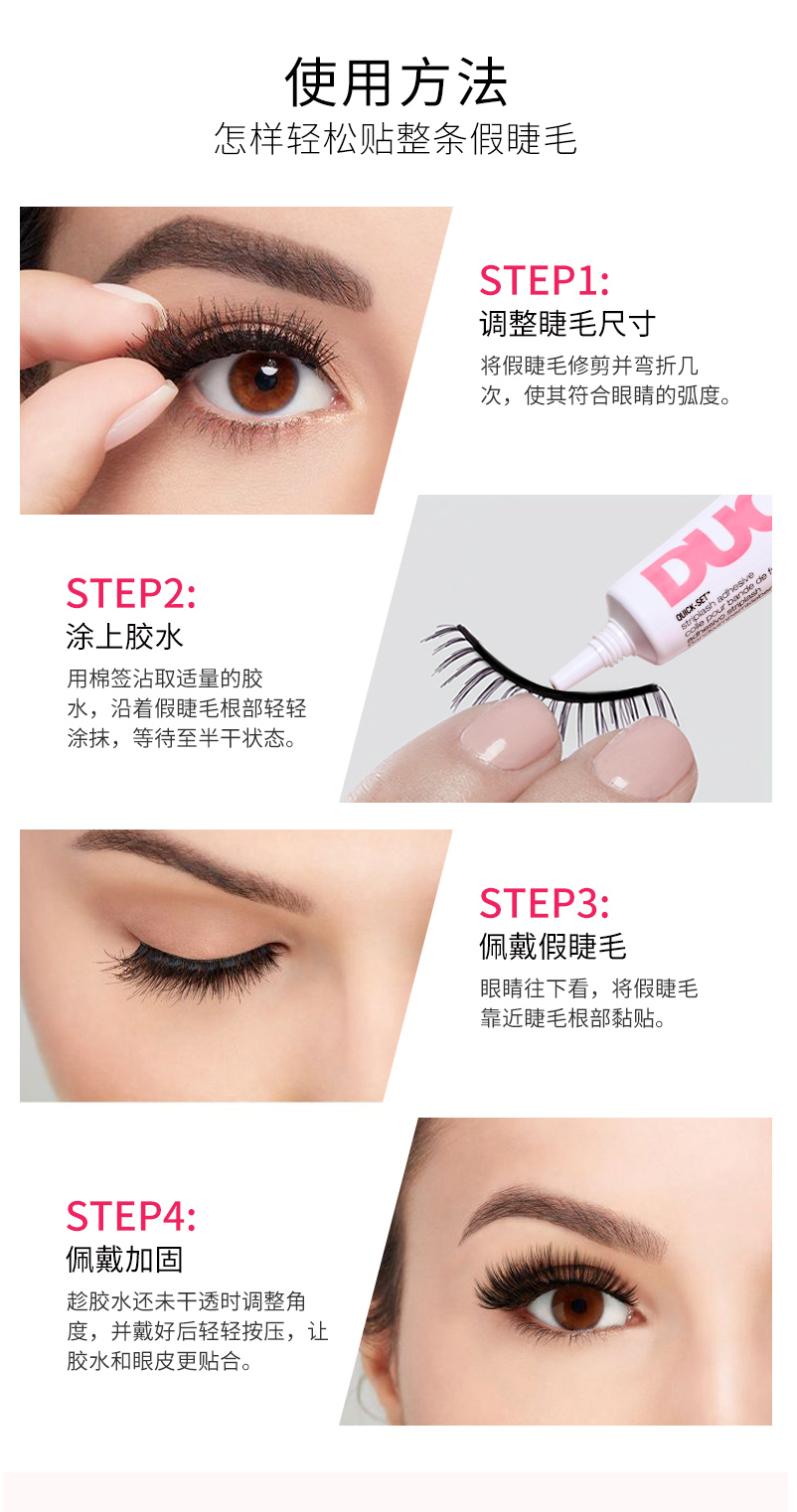 使用方法 : 第一步:调整合适的睫毛尺寸。第二步:假睫毛上涂上胶水,等待至半干 。第三步:佩戴假睫毛
