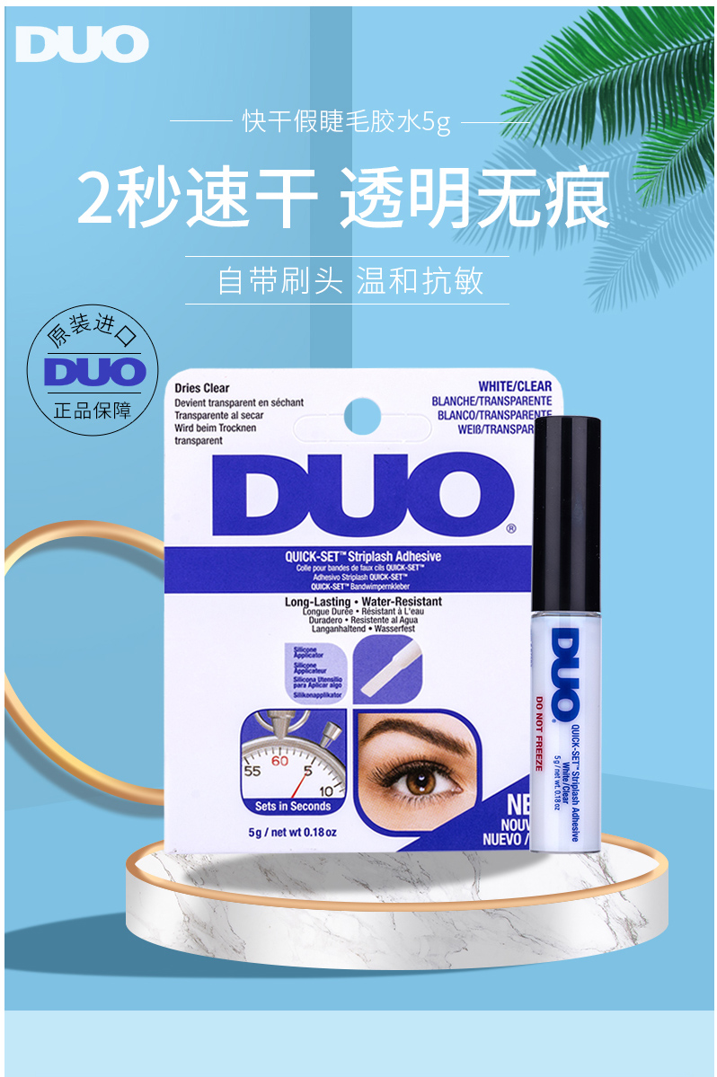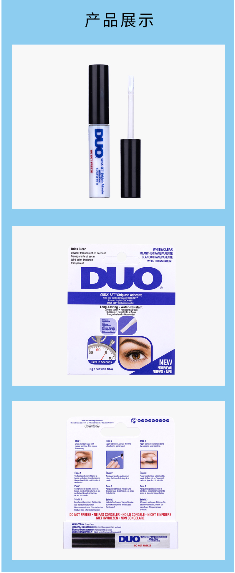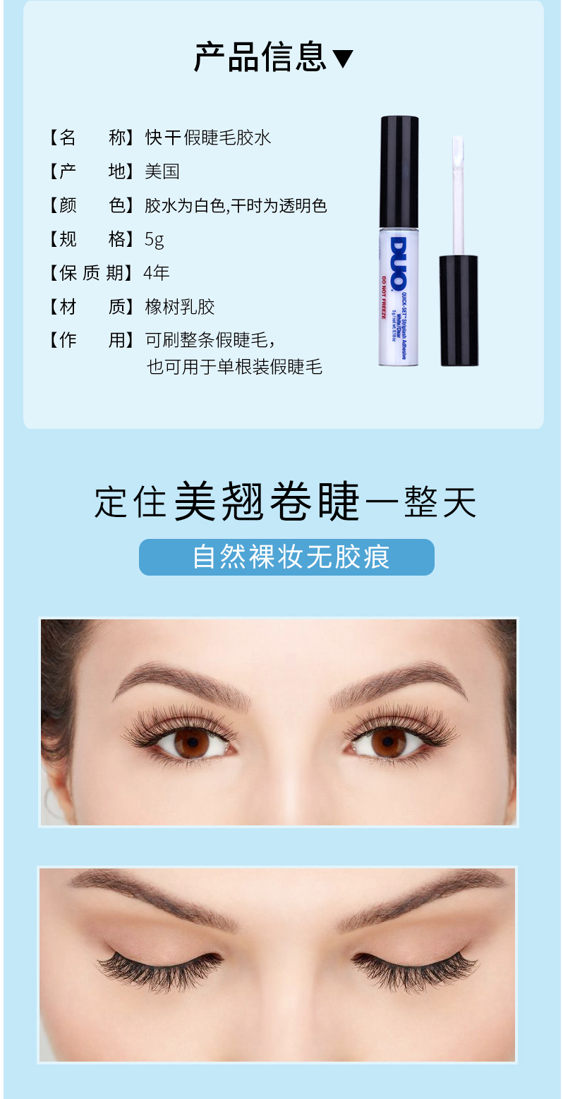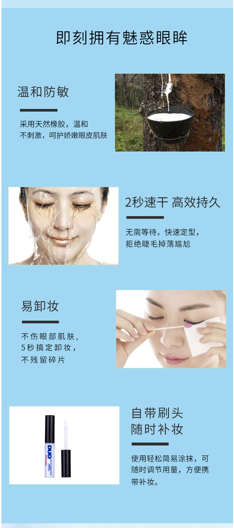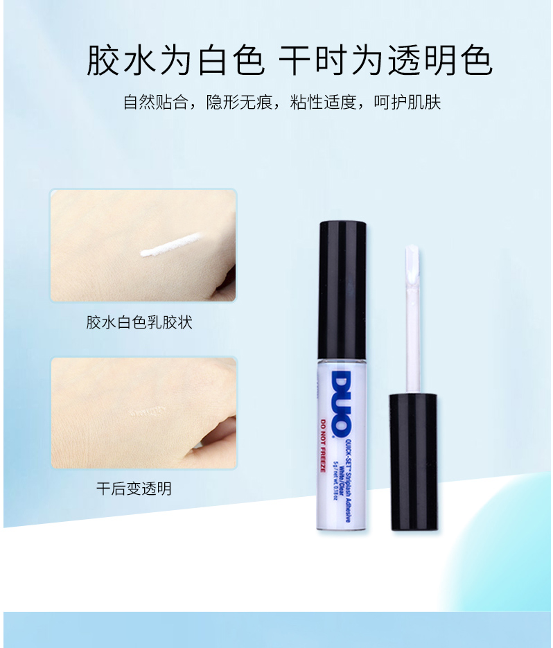 在佩戴睫毛之前,无需等待胶水变黏; 快干配方-数秒即黏; 涂抹时为白色,待干后为透明色; 适用于条带状假睫毛,全天持久; 配方不含甲醛、胶乳、防腐剂和硫酸盐 硅胶刷头,涂抹简单又可控