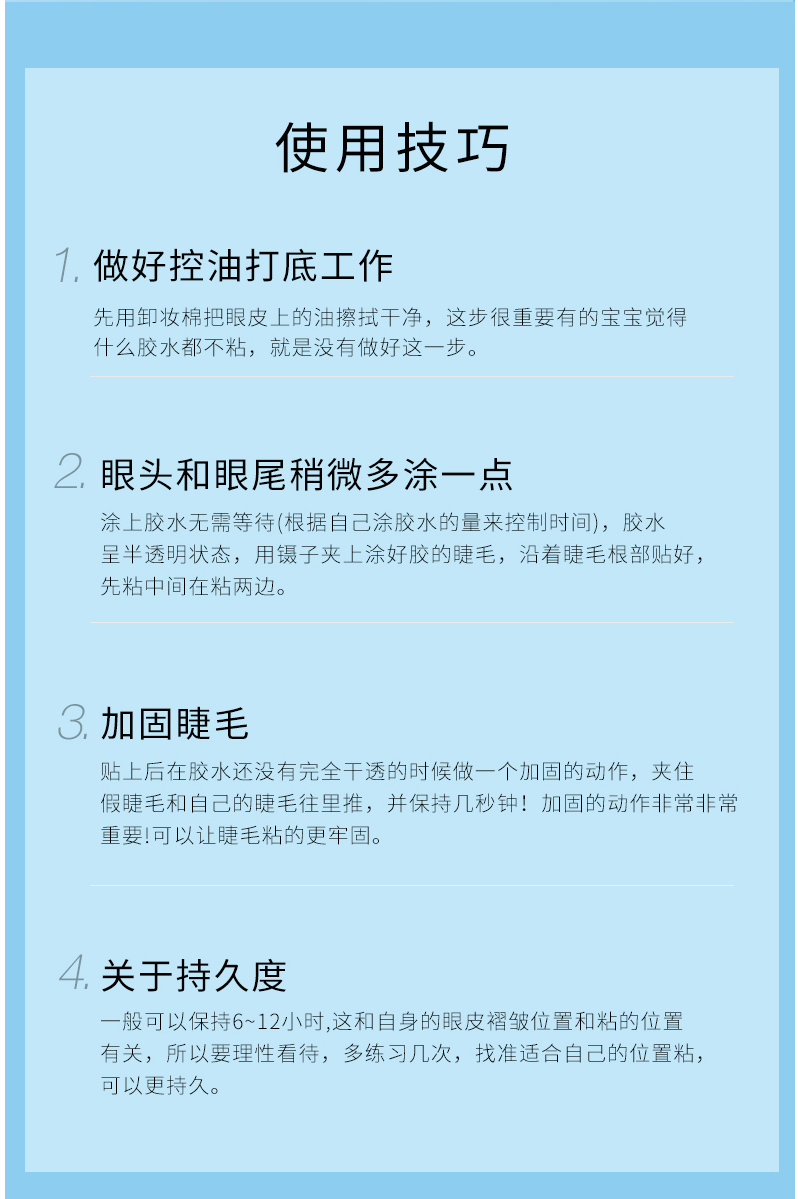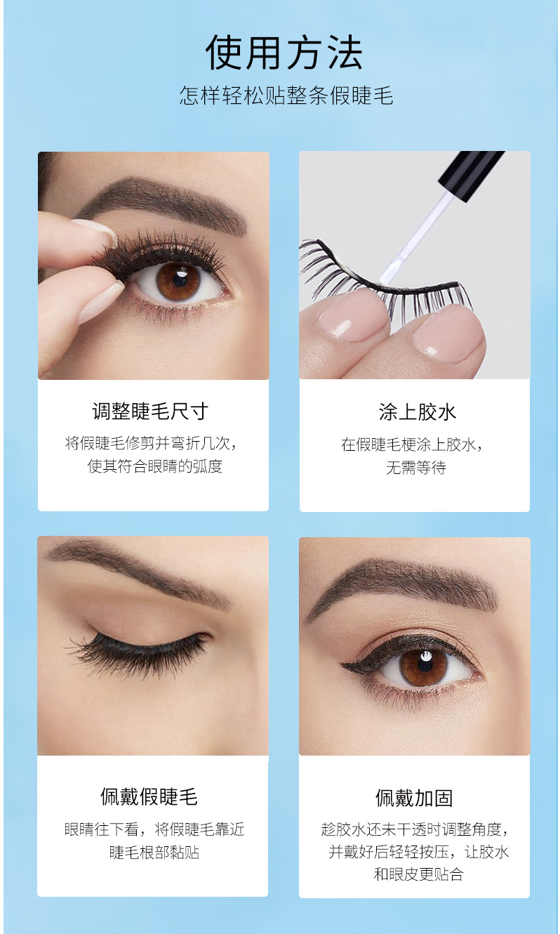 使用方法 : 第一步:调整合适的睫毛尺寸。第二步:假睫毛上涂上胶水,等待至半干 。第三步:佩戴假睫毛