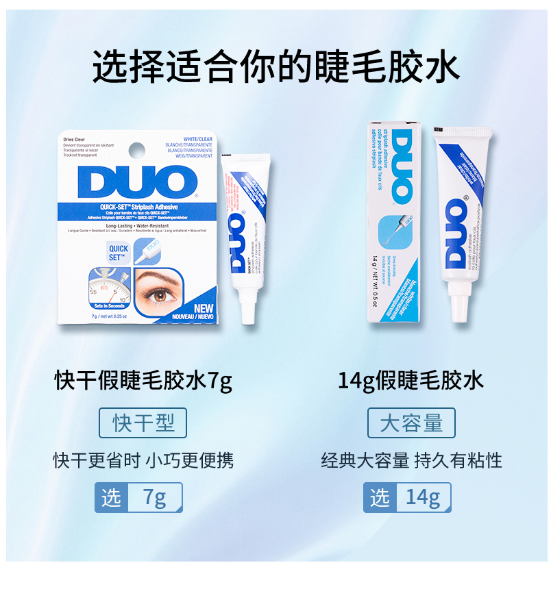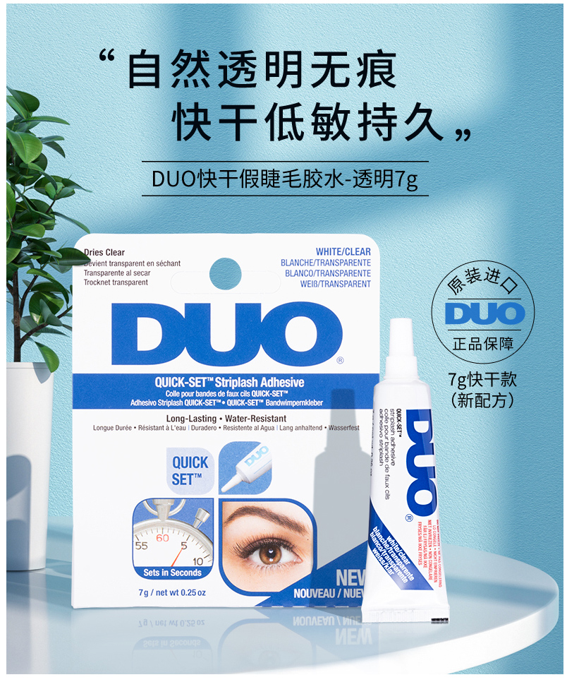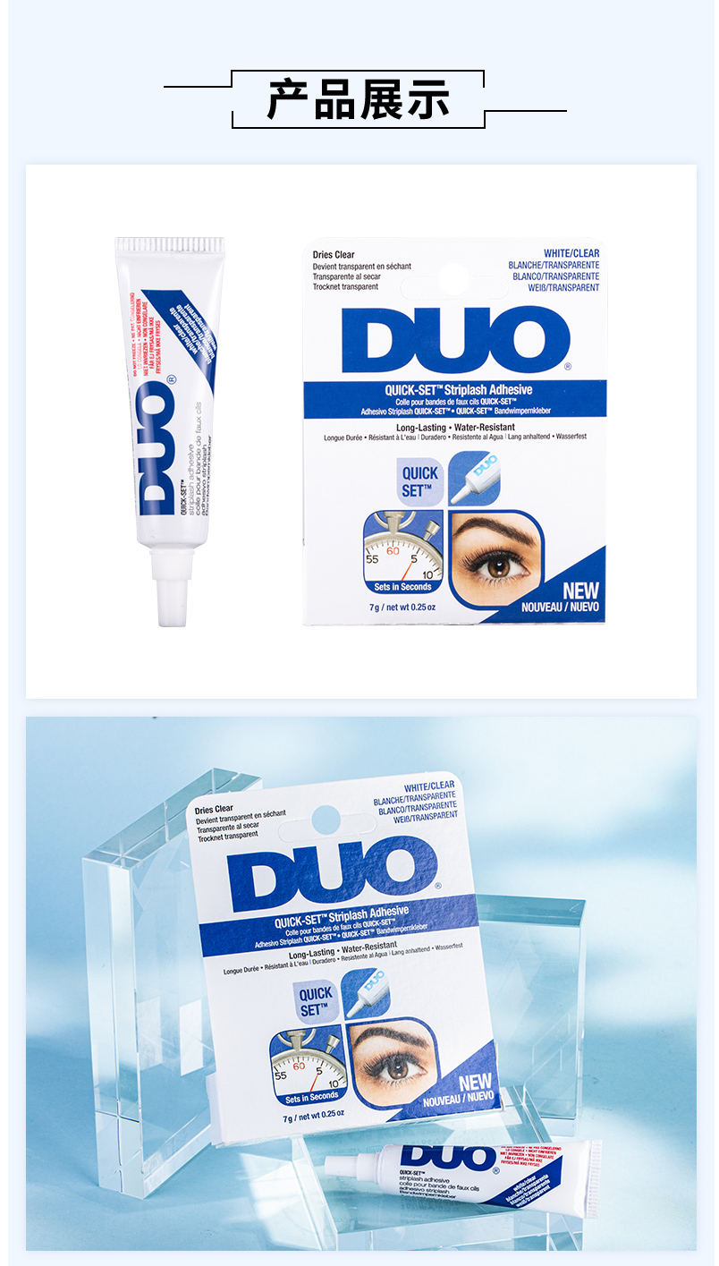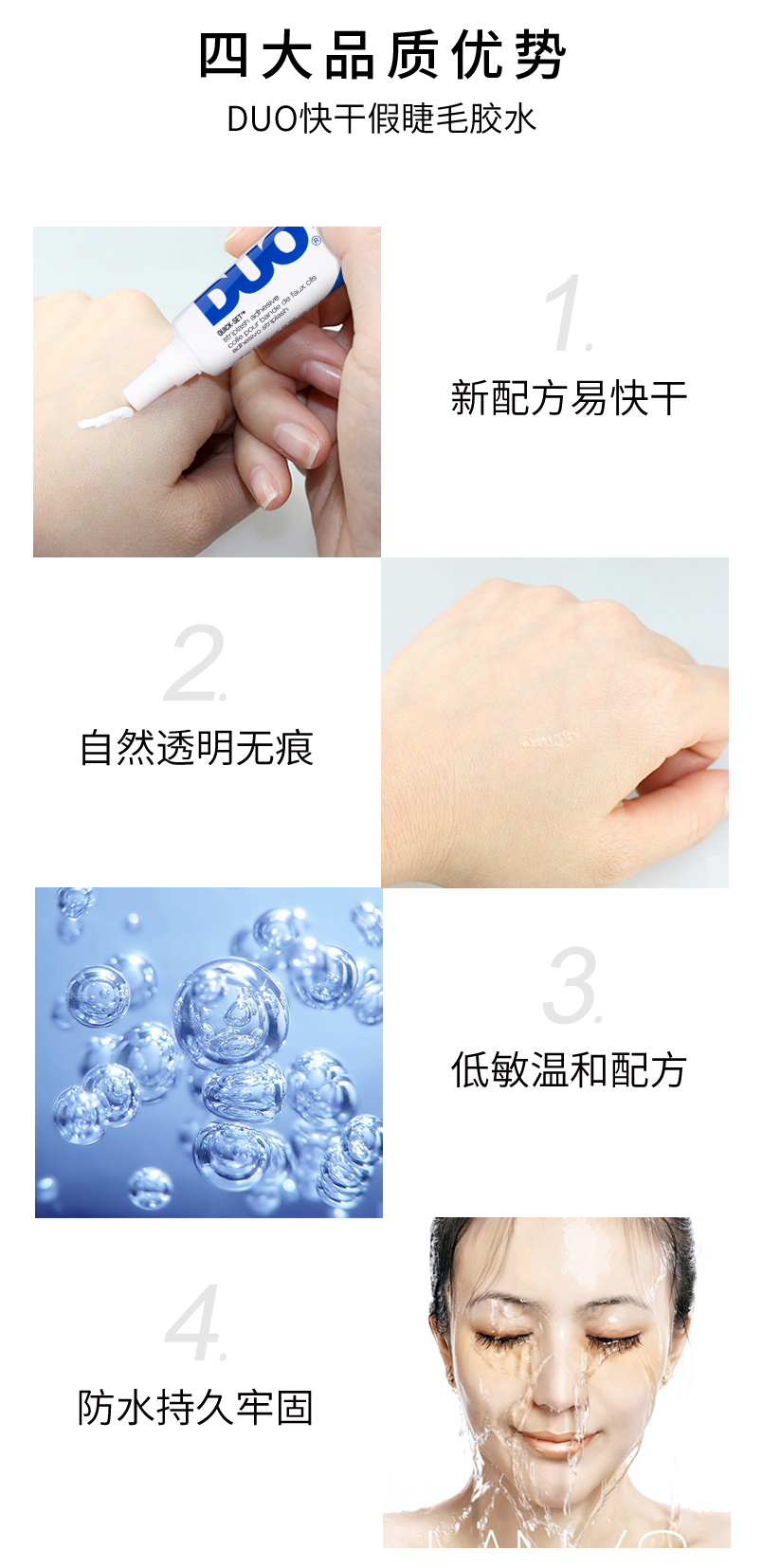 在佩戴睫毛之前,无需等待胶水变黏; 升级版快干配方 - 数秒即黏; 持久、防水、不脏乱; 配方不含胶乳和甲醛,安全易使用; 专业彩妆师和睫毛发烧友的选择