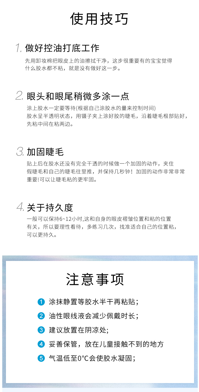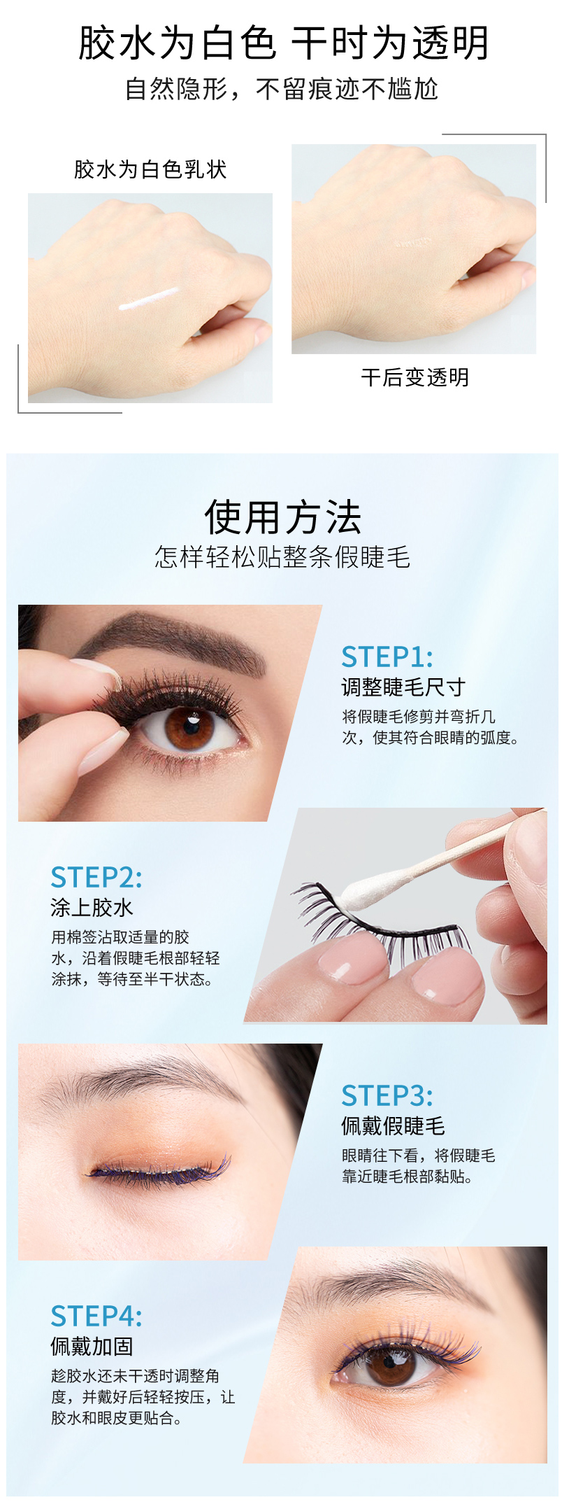 使用方法 : 第一步:调整合适的睫毛尺寸。第二步:假睫毛上涂上胶水,等待至半干 。第三步:佩戴假睫毛